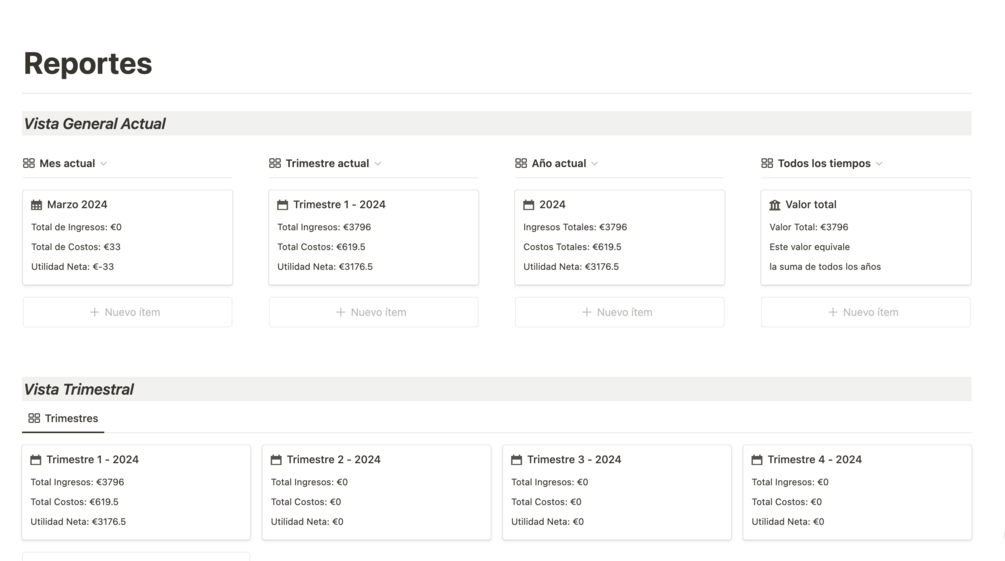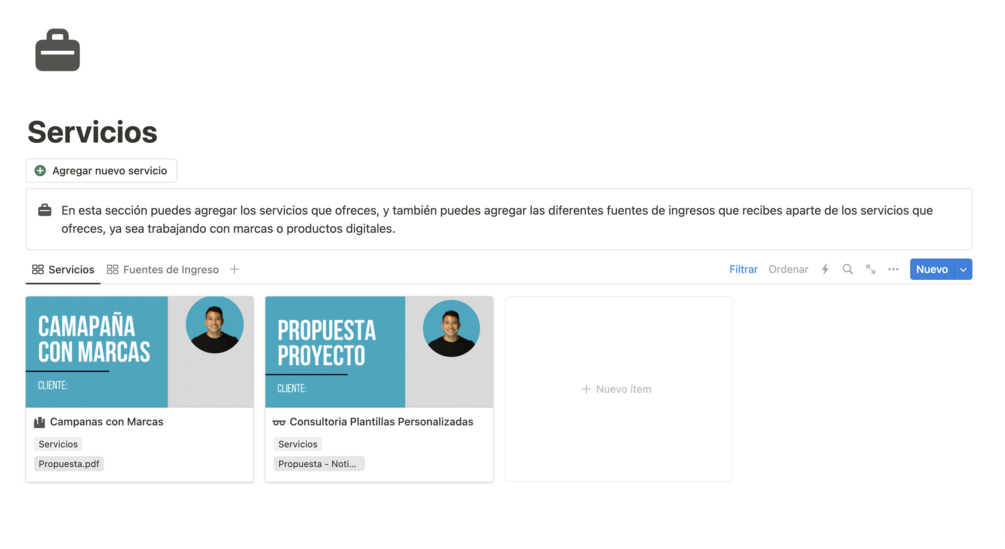 - Base de datos con una vista de Galería que te permite crear y almacenar los diferentes servicios que ofreces y también tus diferentes fuentes de ingresos.