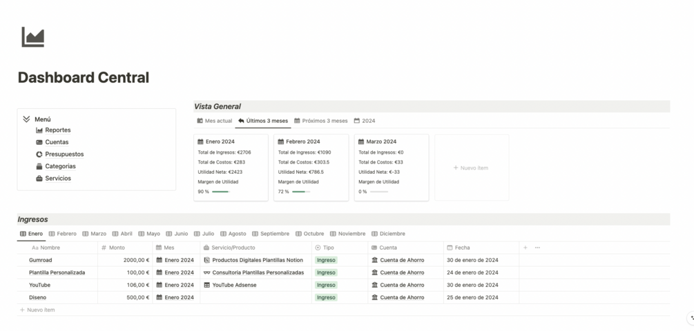 - Base de datos con vistas mensuales para poder registrar de forma sencilla tus ingresos, costos fijos y costos variables de cada mes. Esta base de datos esta relacionada con cuentas, meses, trimestres, servicios y categoría de gastos, lo cual te permitirá actualizar los reportes de ingresos y costos de forma automática.