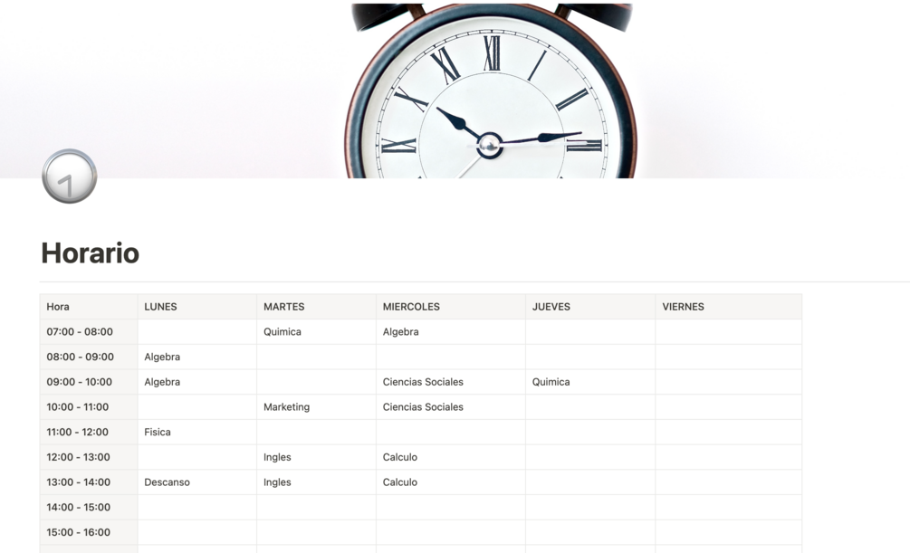 - Plantilla vacia con dias de la semana y horas del dia para guardar horarios de clase.